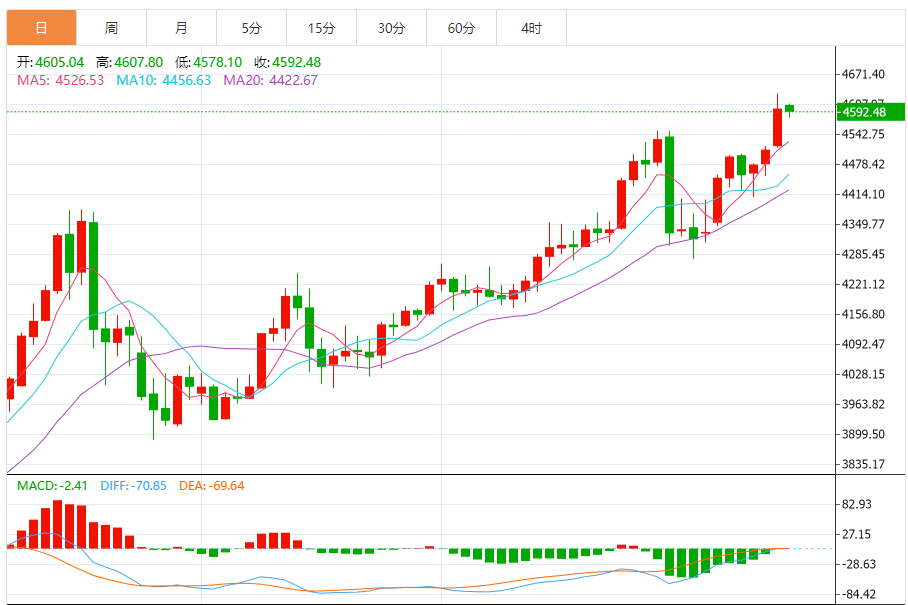 基本消息面 周一(1月12日)纽约尾盘,现货黄金涨1.84%,报4592.13美元/盎司,亚太盘初显著拉升至4600美元,随后持续走高,北京时间00:18刷新历史高位至4630.21美元。 相关新闻消息 特朗普倾向军事打击之际,白宫考量伊朗核谈判提议 美国官员透露,尽管特朗普