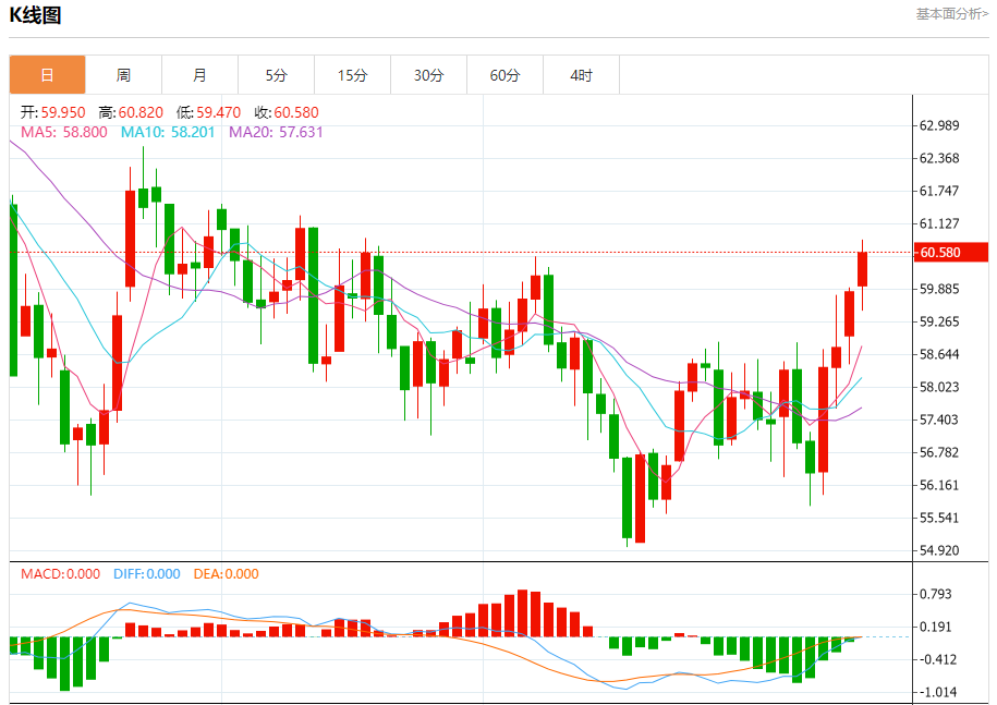 周二盘中,WTI原油报60.690,涨幅2.03%。 今日分析:在59.50之上,看涨,目标价位为60.80,然后为61.50。 技术点评:随后的阻力位是60.80,然后为61.50。 支撑位:59.5058.6557.90 阻力位:62.0061.5060.80 (亚汇网编辑:冰凡)