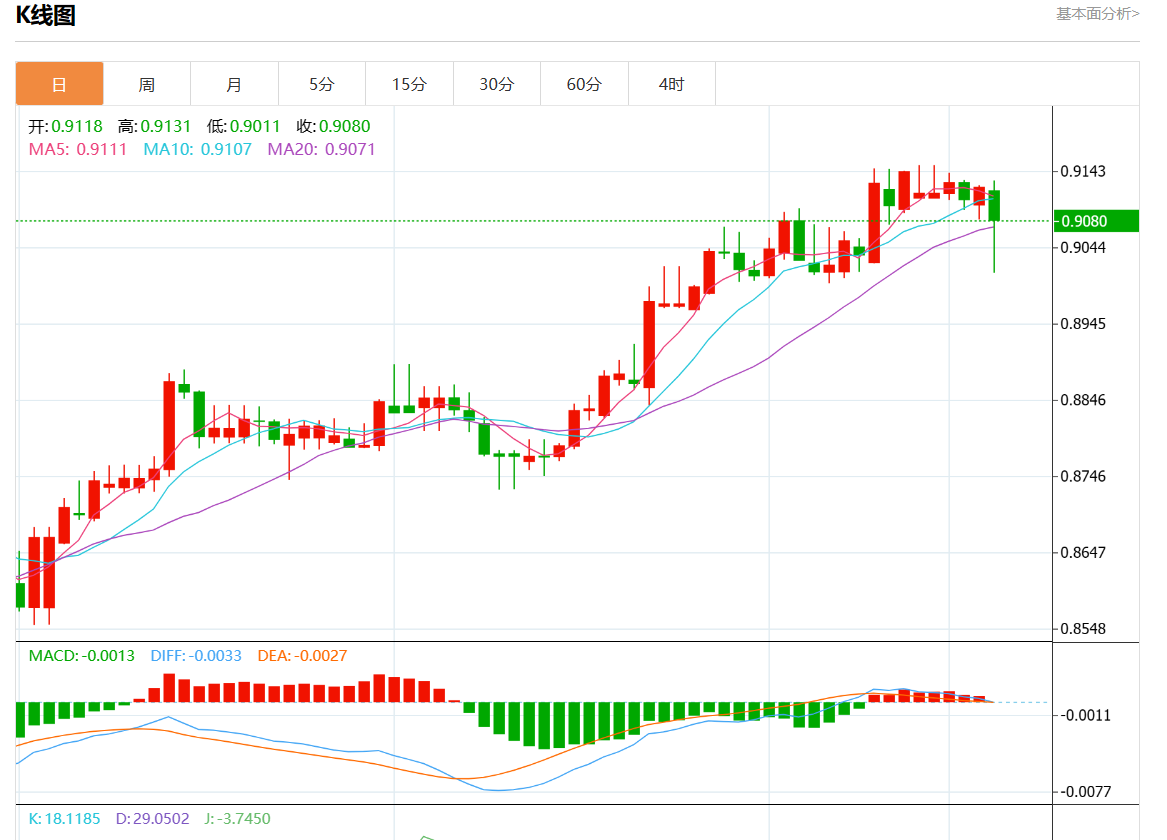 周五盘中,美元/瑞元报0.9077,跌幅0.50%。 今日分析:在0.9050之上,看涨,目标价位为0.9130,然后为0.9150。 技术点评:RI技术指标缺乏下降动能。 支撑位:0.91700.91500.9130 阻力位:0.90500.90300.9010 (亚汇网编辑:静香)