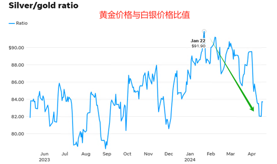ATFX:金银比价自峰值快速回落,最新值约为84倍 ATFX金属:下图为2022年5月至今的黄金价格和白银价格的比值。曲线峰值出现在今年1月22日,数值91.9倍;曲线谷值出现在今年2023年8月30日,数值78.27倍。今年初以来,金银比价一直处于下降态势,按照昨日收盘价计算,COX黄金2376.6美元,COX白银28.29美元,比值84倍。