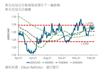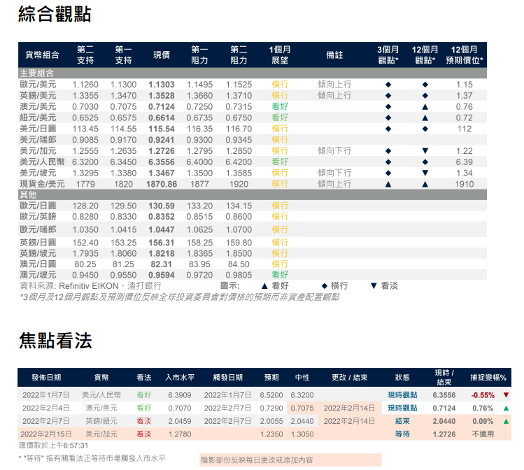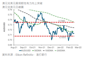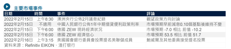 俄乌紧张局势持续,美联储首席鹰派的布拉德支持超前的加息步伐,但其他官员则选择更稳定并依赖数据的方法。总统拜登提名的五个美联储成员,包括主席鲍威尔将在今天的参议院银行委员会将面对任命投票。油价创 7 年高位,股市下跌而债券则稳定令美元指数收高,但仍低於 1 月高位 97.44.在守住此关键水平下, 我们偏好淡化美元升势。除非出现任何地缘政治冲击,否则欧元兑美元在1.1120的关键支持位料将守稳。