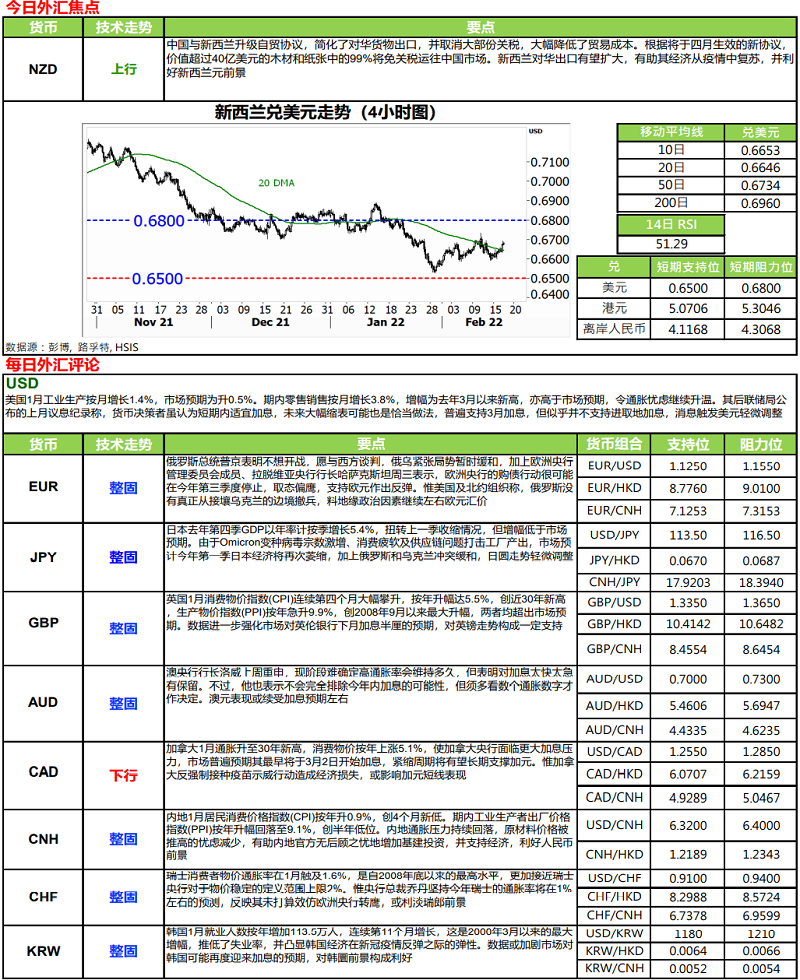 · 英国 1 月消费物按年续升至 5.5%,创近三十年以来高位,较前值上升 0.1 个百份点,市场预期为上升 5.4%.若按月计算,英国 CPI 则微跌 0.1%,是近一年以来首见,前值为上升 0.5%.主要受燃料及二手车价格上升所带动。英国年通胀率明显较英伦银行目标 2%高出不少,正增强市场对英伦银行或需要大幅加息 50 个基点的预期。
