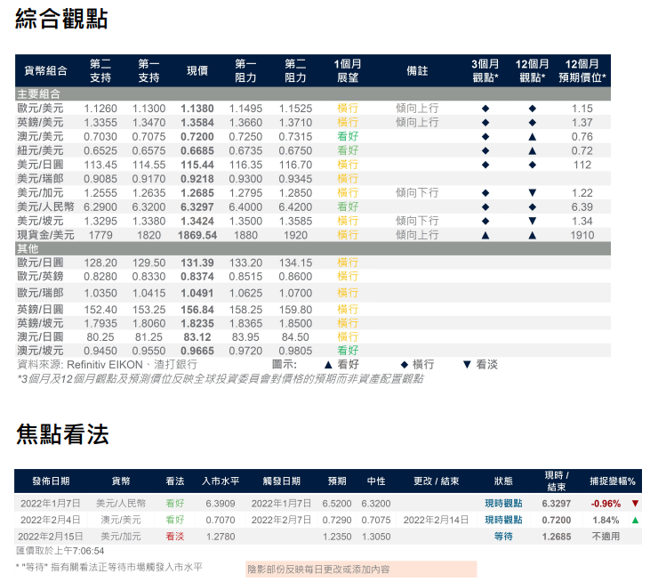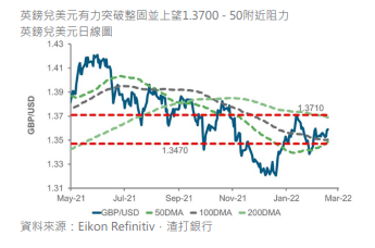 欧元兑美元似乎正进一步确立上升趋势,因欧洲央行委员近日言论反映央行近期政策取态转向,而美联储则似乎正在降低其鹰派立场的措辞。尽管关於俄罗斯与乌克兰之间的争议消息参差,但欧元兑美元仍走近 1.14;我们预期汇价将直接而有力地测试1.1495 - 1.1525关键阻力,前提是1.1260 - 1.1300 支持能够守住。技术上汇价若於後市进一步向上,亦有望产生强劲的动能。尽管市场波动性可能会上升,但若欧元兑美元能够持续突破 1.1525 将加深中线欧元兑美元升向1.1600 - 50,以及美元进一步普遍下跌的机会。