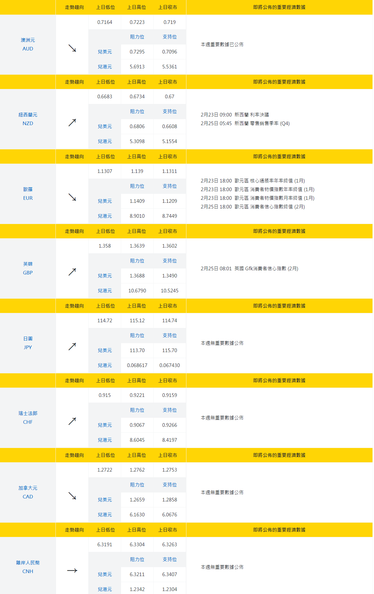 22:45 美國 Markit製造業採購經理人指數初值 (2月) 2月22日 23:00 美國 CB消費者信心 (2月) 2月24日 21:30 美國 GDP季率修正值 (Q4) 2月24日 21:30 美國 初請失業金人數 (19/2月) 2月24日 21:30 美國 續請失業金人數 (12/2月) 2月25日 21:30 美國 核心PCE物價指數年率 (1月) 2月25日 21:30 美國 核心PCE物價指數月率 (1月) 2月25日 23:00 美國 密歇根大學消費者信心指數終值 (2月) |