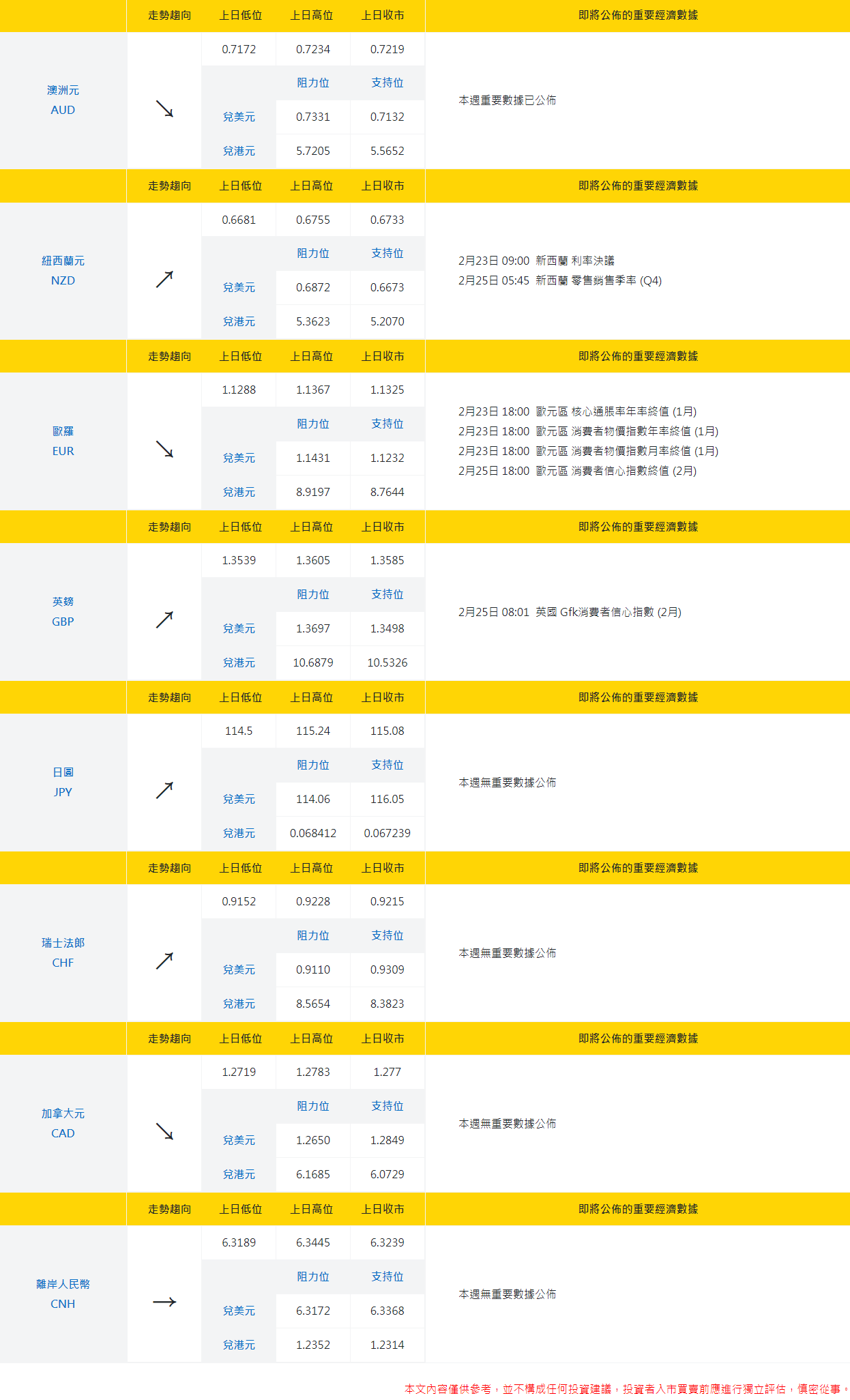 21:30 美國 GDP季率修正值 (Q4) 2月24日 21:30 美國 初請失業金人數 (19/2月) 2月24日 21:30 美國 續請失業金人數 (12/2月) 2月25日 21:30 美國 核心PCE物價指數年率 (1月) 2月25日 21:30 美國 核心PCE物價指數月率 (1月) 2月25日 23:00 美國 密歇根大學消費者信心指數終值 (2月) |