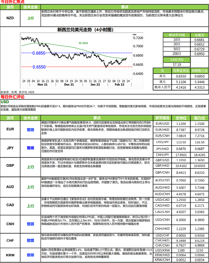 · 德国 2 月 Ifo 商业景气指数续回升至 98. 9,为连升第二个月,且创去年 9 月以来高位,市场原先预期为 96.5.期内,企业经营现况指数亦由前月的 96.1 上升至 98.6,至于预期分项指数则由前月的 95.2 回升至 99.2.数据反映德国企业对疫情好转的乐观情绪,正有助抵消对俄乌紧张局势的担忧。