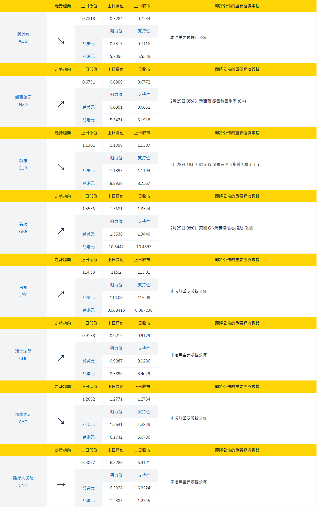 21:30 美國 GDP季率修正值 (Q4) 2月24日 21:30 美國 初請失業金人數 (19/2月) 2月24日 21:30 美國 續請失業金人數 (12/2月) 2月25日 21:30 美國 核心PCE物價指數年率 (1月) 2月25日 21:30 美國 核心PCE物價指數月率 (1月) 2月25日 23:00 美國 密歇根大學消費者信心指數終值 (2月) |