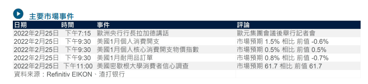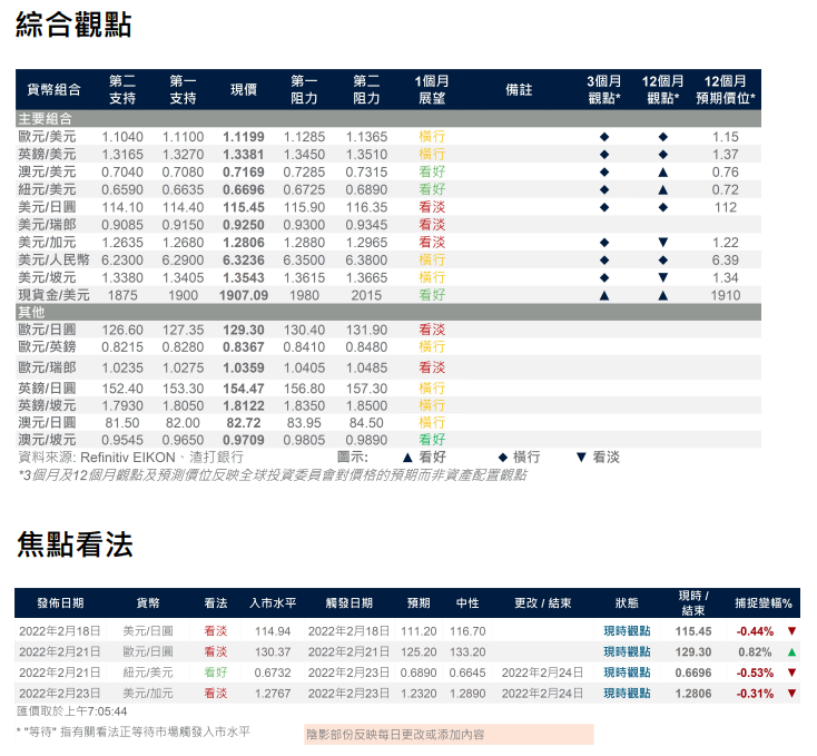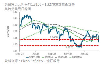 美国及其他国家公布更多针对俄罗斯的制裁措施,但未有如市场所担忧的激烈程度,支持风险胃纳并带动美股反弹。黄金和WTI 油价从高位大幅回落,美元指数从新的趋势高位下跌,而欧元兑美元仅仅创下新的趋势低位後出现反弹。该货币组合可能还会测试於 1.1040的技术支持位,但若能升破 1.1285 可能会令展望转趋稳定。只要英镑兑美元能守稳在 1.3165的支持位,我们认为该货币组合将整固并朝着初步阻力位1.3450进发。日圆在市场动荡下是表现温和的避险资产,我们仍然倾向看跌美元兑日圆。
