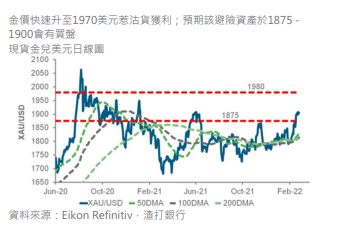 黄金飙升并突破多个阻力位,在略低於1980美元的水平见顶回落。随後的急剧下降可能是获利盘平仓及改善超买的技术走势。黄金应可继续受到避险需求以及美联储在 3 月份可能不太激进的加息举动所支持。在1875-1900 的支持位应该可以吸引投资者。