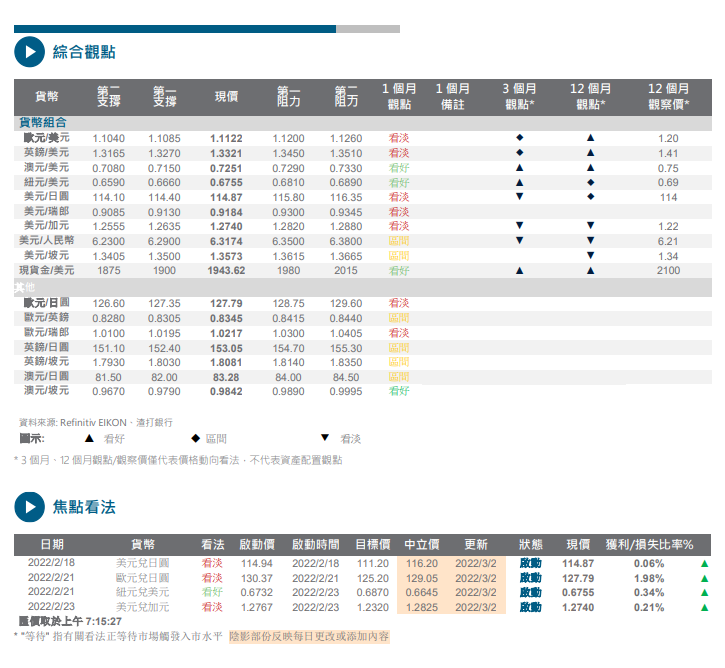 乌克兰遭俄国入侵的恐惧与不确定性干扰市场情绪。美国国债收益率与美股下跌,西德州原油价格飙升 7% 至每桶107 美元,为 2014 年以来的新高。由於投资者采取分散配置,货币组成包括传统避险货币瑞郎和日圆,并搭配商品货币如澳元、加元和纽元,而美元仅能从避险需求中稍微受益。欧元兑美元的趋势新低显示近期恐测试技术面支撑1.1040.欧元疲弱显示於其对瑞郎的走势,该货币对跌至自 2015 年以来低点 1.02 附近。若汇市动荡加剧,央行干预的可能性可能提升。
