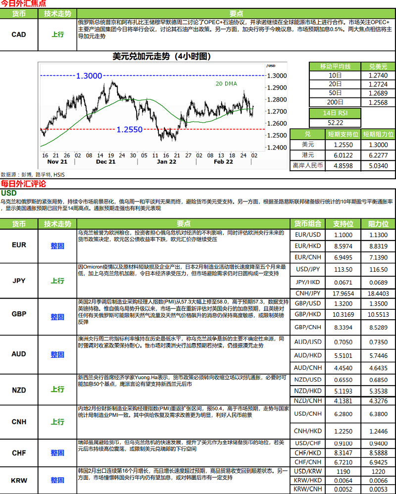 · 中国 2 月份官方制造业采购经理指数回升上 50.2 指数点,前值为 50.1.市场一直担心该数字于 2月份有机会跌穿 50 点的盛衰分界线,现市场总算暂可松口气。现关注于 3 月 16 日联储局一旦加息后,环球对整体货物需求会否因而减少。而俄乌局势又会否对环球供应链造成损害。中国作为世界工厂,这一切变化也可不利中国制造业。