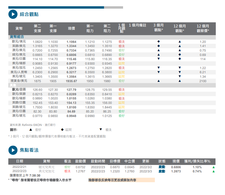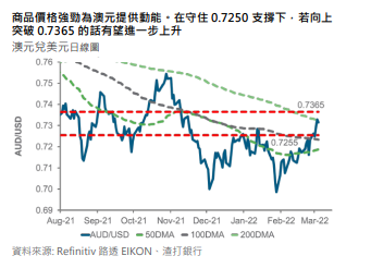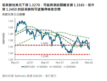 美元指数小幅上升至接近 98.00 的新高, 俄罗斯军队攻势加强,据报导称双方已提议总统泽连斯基与普京进行会谈。欧元下跌,若没有外交解决方案战事恐怕会延续,我们认为欧元还有进一步下跌可能。若跌破 1.10 则会延伸至下一支撑位 1.0820 和 2020 年低点 1.0635.我们不排除在市场极端不稳定之下欧洲央行可能采取干预措施以支持欧元,并符合在应对地缘政治威胁时需采取金融体系制裁的做法。