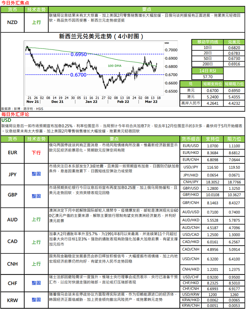 · 美国联储局于议息会议后宣布,加息 25 个基点至 0.25%-0.5%,符合市场预期,是自 2018 年以来再次加息。并预期将于五月会议开始减持美国国债、机构债务及按揭抵押证券,且指出年内剩余的六次会议均可能加息。据最新利率位图中值显示,当局预计 2022 年将加息共 7 次至中值 1.9%,较上一次即去年 12 月位图中值的 3 次为多。而 2023 年再加息 3 次至中位数 2.8%,至 2024 年则不会加息。此外,联储局亦下调年内经济增长预测至 2.8%,低于早前预期的 4%.但上调通胀预测1.4 个百分点至 4.1%,至于失业率预测则维持于 3.5%.对于俄乌事件,局方指出将为美国经济带来高度不确定性,相反或为通胀造成额外的上行压力,为经济前景造成影响。不过,局方指经济将面临「软着陆」挑战,并期望经济平稳回落至合适水平,明显反驳市场对经济或出现「滞胀亅风险的担忧。