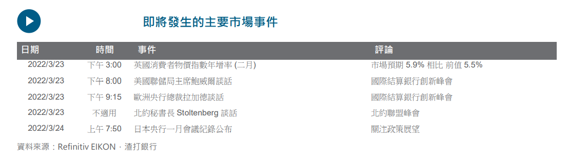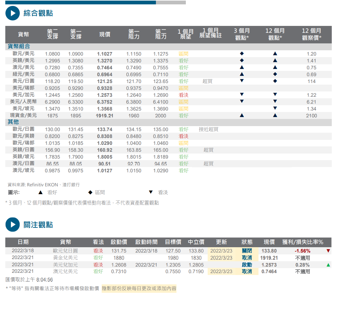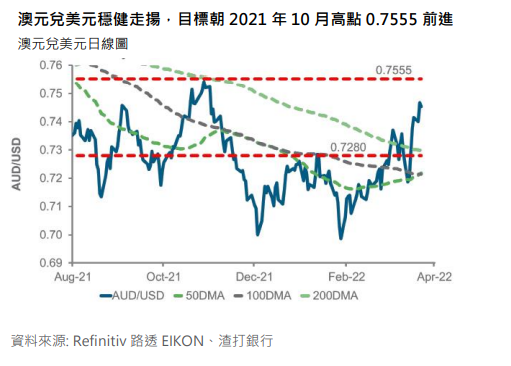 风险情绪有所改善,市场预期美联储可能在 5 月和 6 月各加息 0.5%,美国国债收益率和美股收涨。美元指数持平,但其他主要货币走势仍分歧,澳元、纽元和英镑强劲上涨,而日圆则大幅下跌。欧元兑美元跌至 1.0960 後反弹至 1.10上方,我们观察欧元会否突破 1.09 - 1.1150 区间为近期走势提供方向。