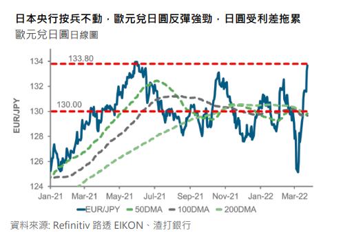 由於日本央行行长黑田东彦重申不考虑收紧货币政策,美元兑日圆大幅走高,目前在短短两周内上涨了 5% 以上。利差对日圆的影响很大。美元兑日圆和大部份交叉盘都显示近期日圆面对严重超卖,可能将出现修正反弹或盘整,但由於今日上午欧元兑日圆突破了中性价位,我们关闭了看跌欧元兑日圆的观点。