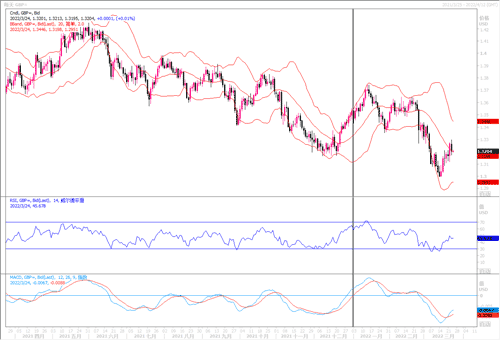 自美联储主席鲍威尔周一发表加息强硬的讲话后,旧金山联储主席和克利夫兰联储主席将成为在美联储5月会议上进行更大幅度加息的政策制定者,上述两位均是支持大幅加息的联储成员。在周三外汇市场上欧元兑美元回到1.1000以下。而乌克兰紧张局势升级,导致石油和小麦等大宗商品价格攀升,这给受供应链瓶颈影响本已高企的通胀带来了额外的上行压力。欧元为此也是经受重压。欧元兑美元本周已连续出现跌势行情,目前在4小时图上,欧元兑美元仍低于20周期短线下方,技术指标处在中线区域,指向不太明朗。下方若是跌穿1.1000支撑,料欧元的跌势将会延续,下方初步支撑在1.0950,随之是1.0900。