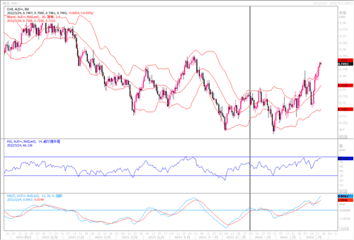 澳元兑美元受惠于美国股市,在过去6个交易日中有五个交易日大幅上涨,盘中最高触及自上年10月份以来的高位0.7507。但乌克兰冲突仍在继续,令澳大利亚大部分关键商品出口的价格承压下降,考虑到能源等大宗商品价格的继续攀升对全球经济增长造成的损害,澳元进一步的反弹动能恐要遭到一定的抑制。日线图上,技术指标RSI进入超买状态,且有顶背离迹象,须警惕澳元兑美元突破0.75无果而产生高位获利回吐调整行情的出现。若出现回撤行情,下方支撑区域将落于0.7380-0.7420之间。