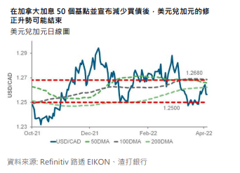 由於经济表现强劲且劳动市场紧张,加拿大央行宣布加息50 个基点并将开始收紧量化宽松措施後,美元兑加元自1.2675 下跌。美元兑加元跌破 200 日均线,来到 1.2500-35 的初步支持,若跌破的话则可能进一步向下测试 1.24.