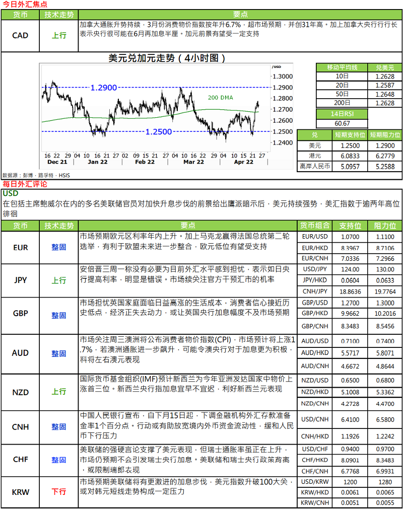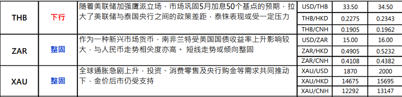 · 德国 4 月 Ifo 商业景气指数续回升至 91.8,略从前月的 14 个月低位反弹 1 个指数点,市场原先预期为 89.1.期内,企业经营现况指数亦由前月的 97.1 上升至 97.2,至于预期分项指数则由前月的84.9 回升至 86.7.数据反映德国企业信心在遭受俄乌危机的首轮冲击后,似乎开始尝试作出反弹。