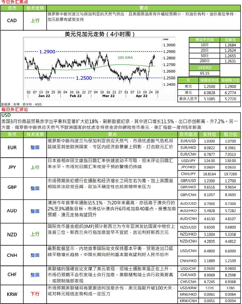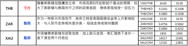 · 澳洲第一季消费物价指数(CPI)按季及按年分别上升 2.1%及 5.1%,升幅远高于市场预期的分别1.7%及 4.6%,且年通胀更创近 21 年高位。期内,核心年通胀率则上升 3.7%,创近 13 年以来高位,且远高于澳央行制定的 2% - 3%目标范围,澳央行曾多次预计当地核心通胀到 2023 年亦未必能重返 2.5%水平,籍此为维持宽松政策护航,现在显然一切已超出央行意料。鉴于通胀已经超标,市场预期有待下月更多首季经济数字公布,以及 5 月 21 日澳洲联邦大选后,澳央行最快将于6 月开展加息周期。
