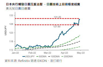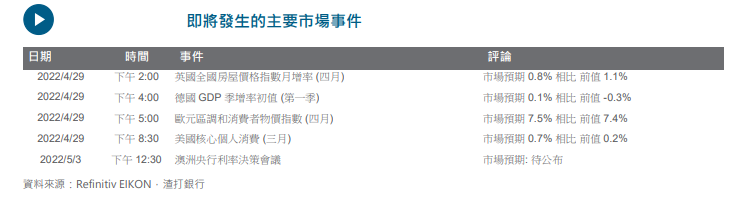 明显地外汇市场的转向正蓄势待发。月底前的连假可能会令市场交易量减少、欧洲的地缘政治仍在发酵、近年来最为偏鹰的联储局将於下周议息,至於中国的封城措施亦继续令全球经济受压。美元指数刚触及自 2002 年 12 月以来的新高,大部份美元兑外币汇价已显示超买;日圆的沽压抛售或将告一段落,现时市场仓位仍倾向为美元长仓。