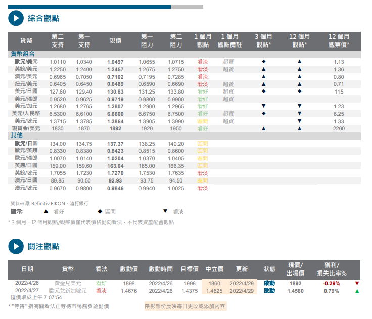 基本面显示目前的美元上升仍是市场主轴,若乌俄局势进一步恶化亦恐怕会再度推升美元。然而,市场整体似乎已准备好出现突发修正或走势逆转的情况。我们关注黄金、澳元和加元等尚未显示美元超买的商品及货币。