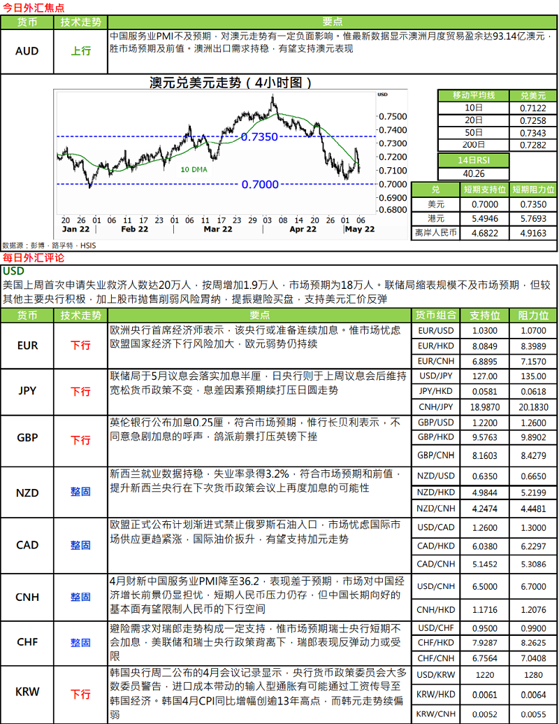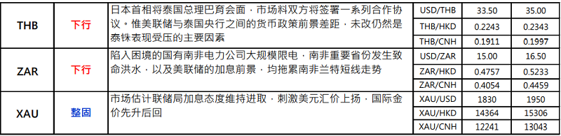 · 英伦银行于昨晚(5 日) 的议息会后,一如预期宣布加息 25 个基点至 1%水平,是连续第四次加息,且息率为 2009 年初以来最高。于 9 位投票支持加息的委员当中,有 3 位支持加息 25 个基点。此外,多数委员认为未来数月,进一步收紧货币政策仍然合适,且由于利率已提升至 1%,故将考虑开始出售持有国债。英伦银行虽保持鹰派立场,但受俄乌事件及通胀持续高企影响,央行大幅调低本年全年经济预测,由原先估计增长 1.25%,下调为收缩 0.25%,明年亦只有 0.25%增长,低于早前预期的 1%.又预期通胀未来数月会升至 9%,到年底更会达到 10%.担心英国经济将出现「滞胀」情况,拖累英镑汇价于议息结果公布后不升反大幅大跌。