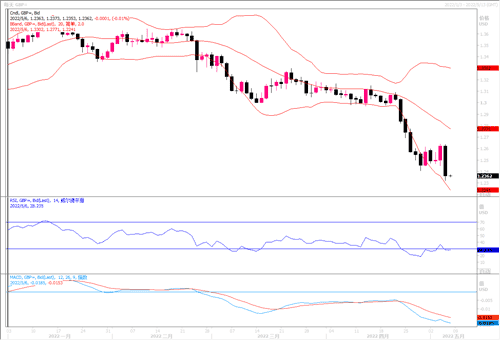 周四(5月5日)英国央行如期加息25个基点,决策层全票支持加息,但英国央行决议看衰未来经济前景。英国央行行长贝利召开新闻发布会,承认近期通胀率远高于目标,但认为货币政策必须平衡控通胀和保经济,暗示更激进加息可能性不大。自英国央行决议公布以来,汇价累计暴跌近170点,盘中最低曾跌至1.2322再创年度低位,创2020年7月以来新低。随着生活成本渐涨,消费者信心接近历史低点,零售额连续两个月下降,经济放缓甚至可能出现衰退的迹象正在加剧,英国央行对收紧货币显得愈发谨慎,以避免经济衰退。由此可见,今后英央行加息步伐和幅度都绝不会比美联储激进,因此息差上的劣势恐会继续压制英镑的反弹表现。前期有加息预期的加持,相比欧元等货币来说英镑跌幅有限,在在鞋子落地加息有可能不再持续的情势下,英镑恐存在继续震荡下跌走低的趋向。若是进一步走低,下方需关注的支撑点位将分别留意2020年到过的1.2256、1.2139这些位置。