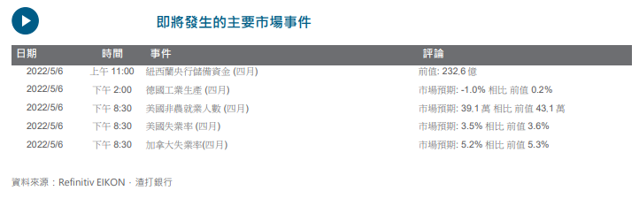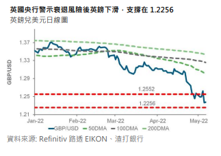 美元指数和美国国债收益率上升,全球股市则遭遇抛售,因为投资者担忧美联储加息步伐加速可能导致经济增长大幅放缓,市场风险情绪恶化。英镑兑美元跌至 1.2322,为2020 年 6 月以来的最低水平,而英国央行将 2022 年第四季的通胀预期上调至 10% 以上,并预测 2023 年经济将萎缩,英国经济衰退风险升温。英国央行一如预期将利率调升 25 个基点至 1%.英镑兑美元的支撑在 1.2256;由於目前英镑处於超卖,下降趋势或暂缓。阻力则在 1.2552.