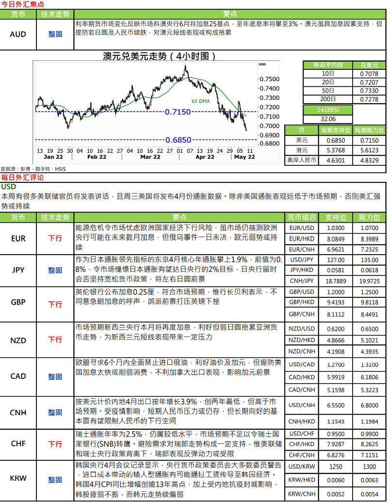 · 美国 4 月新增 428,000 个非农职位胜预期,失业率虽维持不变于 3.6%水平,但每小时工资增长按年比却维持于 5.5%,只较 3 月的 5.6%略低,但仍属高增长数字。当工资也有 5.5%,这样美国通胀就更难跌返联储局所制定的 2%目标水平。回观美债市场,一方面担心通胀高企不下,一方面担心联储局缩表后美债市场将失去联储局这个大买家,美国 10 年债券孳息率不断走高,周一曾上穿3.2%水平。现关注美债息不断走高情况下美国经济能否承受。