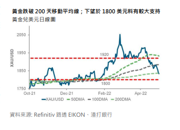 黄金下跌并失守在 1836 美元附近的 200 天移动平均线,反映投资者在通胀数据公布前的紧张情绪,该数据也可能将令投资者对联储局政策的进取程度作出评估。黄金较强劲的支持位在於 1800、而阻力则在於 1920 美元。