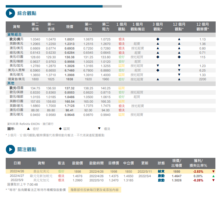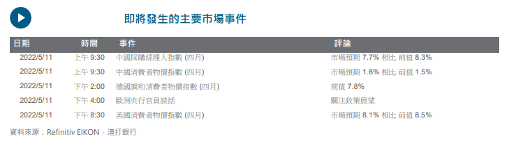 美元指数和美股收高、美国国债收益率下跌,反映投资者重新评估今晚将公布的美国消费者物价数据所透露的通胀前景。由於市场仍关注中国防疫措施,以及对经济衰退的担忧日益加剧,使得能源需求前景变得不确定,而油价亦跌破每桶 100 美元。欧元兑美元微跌,但整体仍处於整固阶段,投资者正观望关键的美国通胀数据结果。欧元兑美元的支持位料在於 1.0470,一旦失守的话将强化我们短线看淡的观点,汇价亦可能重新下试 1.0340.我们将密切关注今晚公布的美国消费者物价指数以寻求更多相关指引。