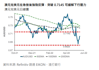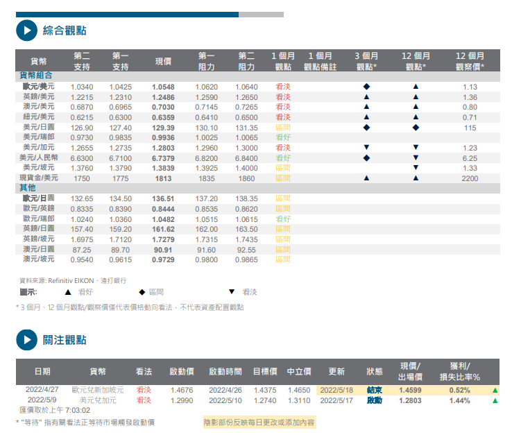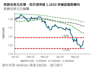 随着经济数据强劲提振风险情绪,美元继续修正走低。美联储主席鲍威尔再次谈到将加息 0.5%,美股与美债收益率双双上涨。但不只美联储态度鹰派,欧洲央行言论与澳洲央行纪录均暗示将采取更为鹰派的取态。中国有望刺激经济加上有开解除封锁的指引也提振投资者信心。我们正关注主要技术位以观察美元趋势的变化。欧元已反弹回升至1.05,但仍处於下行趋势中。只有持续突破 1.0640 才可使技术走势转为更加向好。