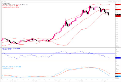 在周二(5月24日)外汇市场上,美元兑日元快速下跌,盘中最低落至126.36,收盘于126.85,全日跌幅达0.81%。美联储的鹰派程度似乎终于稳定下来,与此同时,欧洲央行将政策紧缩预期提前。这种央行动态的变化限制了美元的上行空间,也使得美元近段时间里的涨势出现了停顿。况且分析界开始出现美联储如此鹰派加息所带来的经济将停顿甚至陷入衰退的质疑。为此,近阶段日元表现比较抢眼。当然了,若随后的通胀依然没有回落迹象,且美联储仍保持鹰派加息节奏,那么日元的回升之路可能就会被掐断。技术层面上,日图美元兑日元各项技术指标继续顺畅地向超卖区域延展,并开始形成较为明显的下跌通道。4小时图则进入震荡到突破这么一种拾级而行的节奏。小时图则出现超卖,料将在低位进行整理,跌势有所缓和,等待突破。若美元能保持127.30-128.00区域构成阻力,美元兑日元下行空间可继续加以期盼。