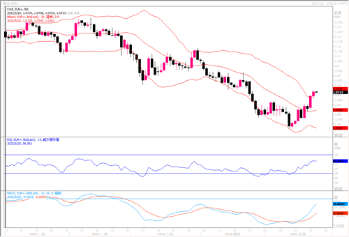 在周二(5月24日)外汇市场上,欧元兑美元继续上攻,盘中最高触及1.0748,全日录得0.44%涨幅,收盘于1.0737水位。 欧洲央行行长拉加德周一表示,到9月底,欧洲央行可能让关键利率脱离负值区域,并可能进一步加息。在欧洲央行暗示将变得更加鹰派后,欧元走强。 美联储的鹰派程度似乎终于稳定下来,与此同时,欧洲央行将政策紧缩预期提前,这种央行动态的变化限制了美元的上行空间。技术面上,欧元兑美元日图向上突破1.0700一线水平,各项技术指标朝超买区域迈进。4小时图高低点上移,仍看涨。但是RSI、MACD、等技术指标在超买区域略出现调整态势,须谨防短线获利调整,经调整后若汇价保持在1.06之上,后市继续攀高仍可期待,上方进攻目标料将是3月份曾经横盘的下沿1.09附近。