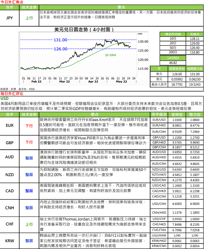 · 美国联储局公开月初会议纪录显示,委员一致同意应该加息 50 基点,当中大部分认为,未来两次会议应该继续以这个幅度加息,并应迅速地将货币政策立场,转向较中性水平。一方面,可避免进一步加剧通胀对经济造成的威胁。另一方面,亦可使局方处于有利位置,在今年较后时间评估须要怎样调整政策。此外,委员会预期美国第二季实际 GDP 将「稳健」增长,全年接近或高于趋势水平。议息纪录反映,局内委员对于加息的取态,较市场预期「鹰派」。不过,局方对经济前景预测仍较乐观,有助缓和市场对美国经济或出现「硬着陆」风险的担忧。
