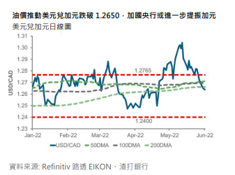 由於欧盟将限制俄国能源供应使得油价走高,美元兑加元持续走低。若持续跌破强劲支持 1.2650 则可能回试 4 月份低点 1.2400.今晚的加国央行利率政策会议可能推动加元进一步走高。市场预估加息 50 个基点,因此投资者焦点将集中在加国央行对经济前景的展望和新闻发布会内容以获得前瞻指引。