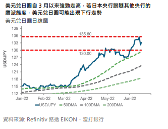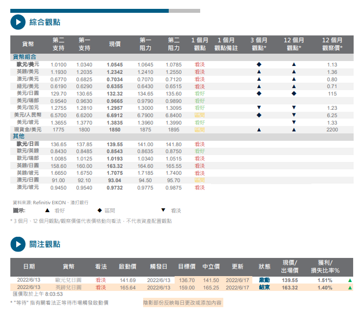 日本央行今天稍後将公布议息结果。市场预期政策不会有太大变化,但市场猜测日本央行行长黑田东彦可能在面临越来越大的压力下调整收益率曲线控制政策,又或是就日圆弱势再向市场发出警告。美元兑日圆可能正在酝酿转势,因汇价已累升不少,而日圆的负面情绪和短仓水平亦有所增加。若日本央行意外偏鹰,美元兑日圆可能会骤降至 130 甚或跌向 126.35 的中期支持区,反之若一切不变的话美元兑日圆可能会回到 135.60 的阻力水平。昨日英镑兑日圆大跌後汇价未有触及目标价位,因此在日本央行议息前,我们结束看淡英镑兑日圆的观点以锁定利润。我们仍维持看淡欧元兑日圆的观点,但亦调整了观点中的价位以管理上行风险并扩大下行收益。
