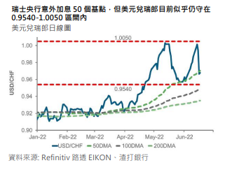 瑞士央行意外加息 50 个基点,是 2007 年以来首度加息,英国央行随後也如市场预期宣布加息 25 个基点。两国央行都表示未来有更大的加息空间。美元回吐但美元指数仍处於近期区间的中间水平。若美元守住 101 附近的支持,有机会再挑战新高,因此我们短期仍看好美元前景。欧元兑美元再次从 1.0340 附近的关键支持反弹,但相信汇价要突破 1.0820 阻力後才可望让观点转为看好。在瑞士央行意外加息後,美元兑瑞郎大幅下跌,但仍维持在过去两个月的0.9540-1.0050 区间内。