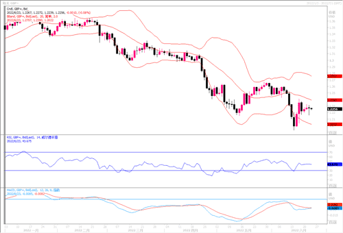 英国5月份的消费者价格通胀率为9.1%,创下40年新高,该数据是显示消费者价格比预期更热的最新数据。英镑最初下跌了近1%,跌至近一周的低点1.2162美元,之后收复大部分失地。除美元指数在欧洲央行加息预期升温和市场的避险情绪降温的联合打压下走软对英镑构成了一定的支撑外,英国央行首席经济学家Huw Pill发表的鹰派言论升温英国央行的加息预期也是支撑汇价的重要因素。日线报收长下影线小阳线,上方阻力并未收复,日线的多空震荡并未结束。从4小时图来看,布林上下轨略有收窄,MACD零轴附近运行,日内上方首要阻力1.2295,第二阻力1.2335,下方支撑1.2220,1.2180。