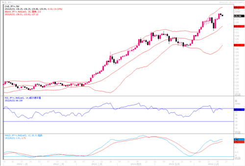 周三(6月22日),在创下24年来的高位后,美元兑日元自高位有所回落,但仍处于136.00近期高点位之上。近阶段日元的大幅走弱,是因为美债收益率继续上涨,与日本坚守低利率政策形成鲜明对比。此外,全球各大央行继续强调提高利率的必要性,凸显了日本与世界其他国家之间的货币政策差距。 鉴于于日本央行在上周的会议上没有改变其政策, 一些投资者继续押注日元将继续走弱。从4小时图来看,布林中轨偏上,MACD零轴上方运行,日内下方首要支撑135.90-136.00,第二支撑135.40,上方阻力136.90,137.40,保持在第一支撑上方短线有望继续测试第一阻力。