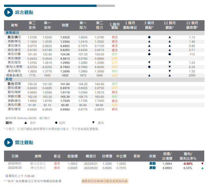 由於市场情绪疲弱令大宗商品价格下滑,商品货币继续下跌。铜价跌至 16 个月以来的最低水平,西德州原油价格接近每桶 100 美元。澳元兑美元走低至支持位 0.6825;若跌破恐进一步下滑。美元兑加元阻力位在 1.3080,若突破该价位将令该货币组合前景转为看好。