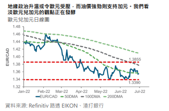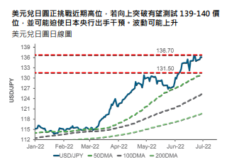 随着油价反弹,美元兑加元的价格走势前景转为看淡。美元兑加元可能稳步下跌至 1.27,而加元在其他货币交叉盘中表现可能转强,我们看淡欧元兑加元的观点似乎正在发酵。美元兑日圆正接近近期高位 136.70,汇价发展备受市场关注,日本官方表示反对日圆走弱,对日本央行结束收益率曲线控制政策的预期增加。我们预计美元兑日圆向上突破後将在 139-140 面临强劲阻力。