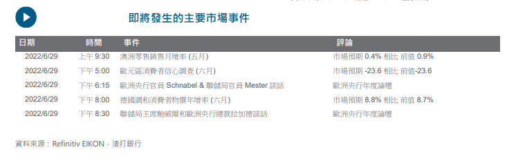 风险情绪减弱,随着油价微升和美股下跌,美元上升。由於市场仍担忧通胀,美国消费者信心数据不如预期,同时也受到地缘政治情绪升温影响。G7 和北约会谈的重点是扩大对俄罗斯的制裁,土耳其取消对芬兰和瑞典加入北约的否决权,这可能引发与俄罗斯的紧张局势升级。市场也在等待稍後於欧洲央行论坛发言的美国联储局主席鲍威尔,以及其他官员的谈话。在此背景下,欧元和英镑料更加脆弱,欧元兑美元跌破 1.0470 的话,可能预示着将测试关键的 1.0340 支持位置。