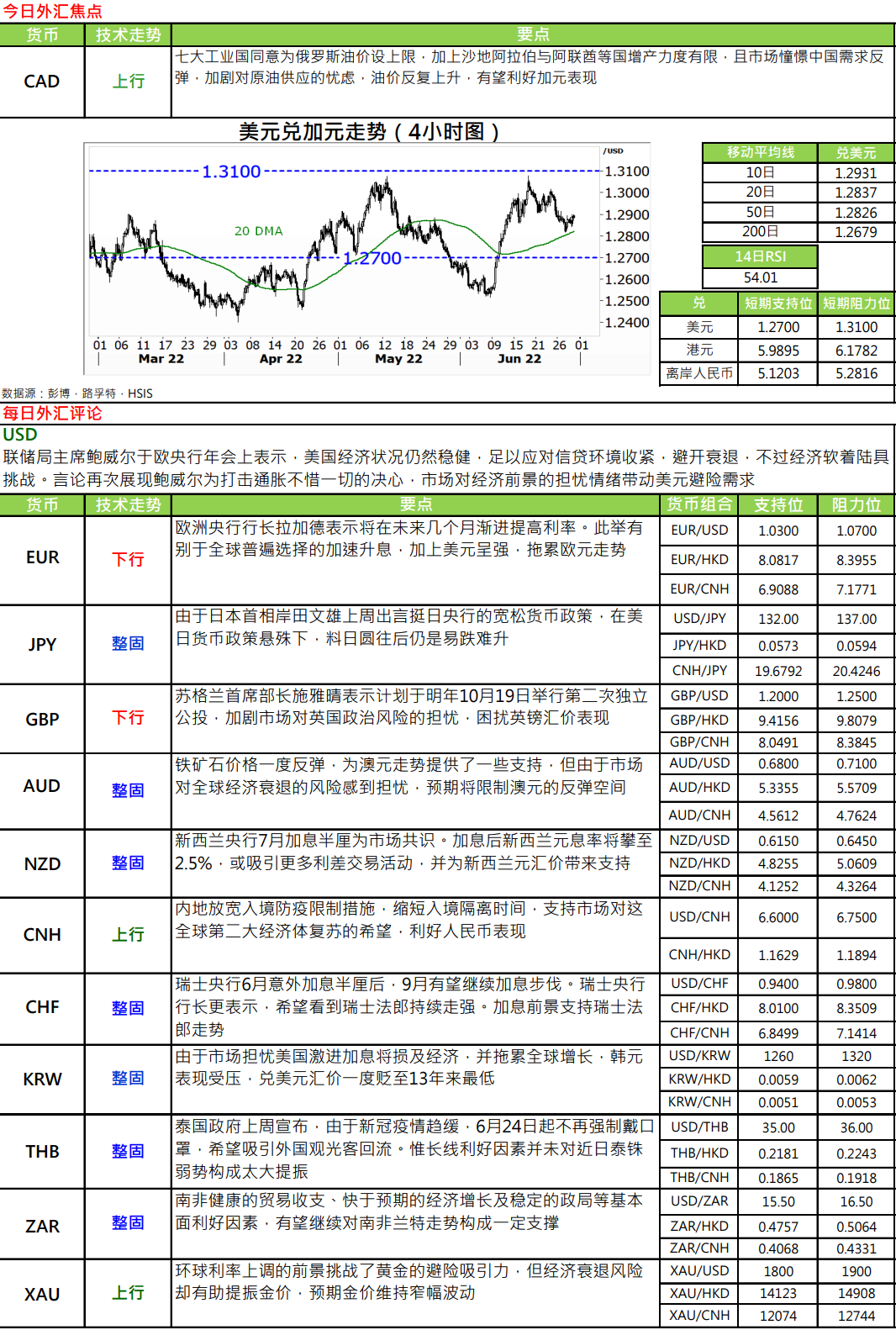 · 聯儲局主席鮑威爾於歐央行年會上表示,美國經濟狀況仍然穩健,足以應對信貸環境收緊,以至失業率上升,同時避開衰退。聯儲局將盡力避免當過渡至高通脹時經濟將出現的震盪情況發生。不過,通脹持續越久,或使經濟軟著陸更具挑戰。言論再次展現鮑威爾為打擊通脹不惜一切的決心,市場對經濟前景的擔憂情緒帶動美元避險需求。