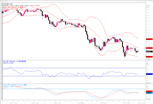 上周五,欧盟统计局公布的欧元区6月份消费物价指数同比通胀率初值达8.6%,是1997年有统计以来的新高,甚至追平了美国的通胀同比增长速度。高增长的通胀率,让欧洲多国民众叫苦不迭,市场对于欧洲央行的迟钝反应也越来越不耐烦。欧元区央行接下来的加息压力应有所增加,但东欧冲突以及能源危机可能造成的经济衰退,又迫使欧洲央行在加息选项上会变得较为谨小慎微。有分析认为,若欧洲央行在7月份会议坚持只加息25个基点,欧元料将面临下行压力。目前欧元兑美元仍挣扎在1.04水平附近,日图上汇价仍处于短期均线下方,技术指标停留在负区域,近期呈弱势姿态,若跌穿5月低点1.0350,走向平价的风险将会增加。向上则要穿越1.06之上,方有望扭转颓势。在本月美欧等央行召开 议息会议前,欧元兑美元暂时预计会陷入窄幅区间波动中,关注区间主要在1.0360-1.0540之间。
