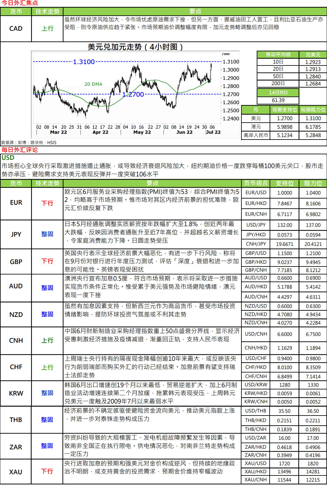 · 英伦银行在金融稳定报告中警告,全球经济前景严重恶化。加上,上海于 12 个地区启动大规模新冠病毒检测。中国是全球最大石油消费国之一,这将加剧市场对全球经济衰退的担忧,加上美元攀升亦降低了大宗商品的吸引力,导致纽约油价大幅下跌近 10%至 100 美元水平。市场正观望下周三 (13 日) 拜登到访沙特之旅结果。不过,沙特宣布 8 月起再度提高出口至亚洲的官方原油溢价 2.8美元至 9.3 美元。