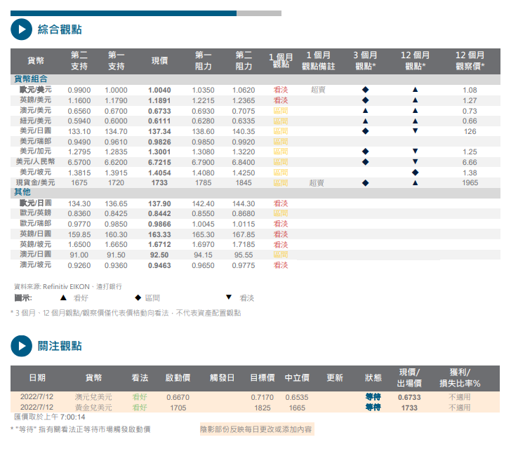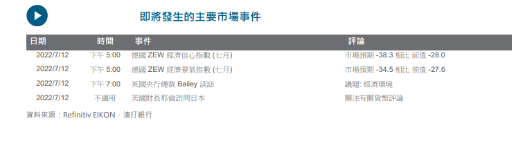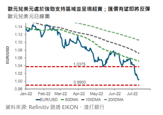 美元指数已升穿 108;现时接近关键的技术阻力 109.15 附近,技术上呈现超买。市场忧虑从俄罗斯到欧洲的主要天然气管道进行维修,或令原油供应中断的时间比原先预计更长,这对欧洲的经济增长前景料会带来压力。欧元兑美元已跌至 1.00 附近的关键技术支持区间,但目前已呈现超卖,我们预计汇价至少短期内能守住支持。