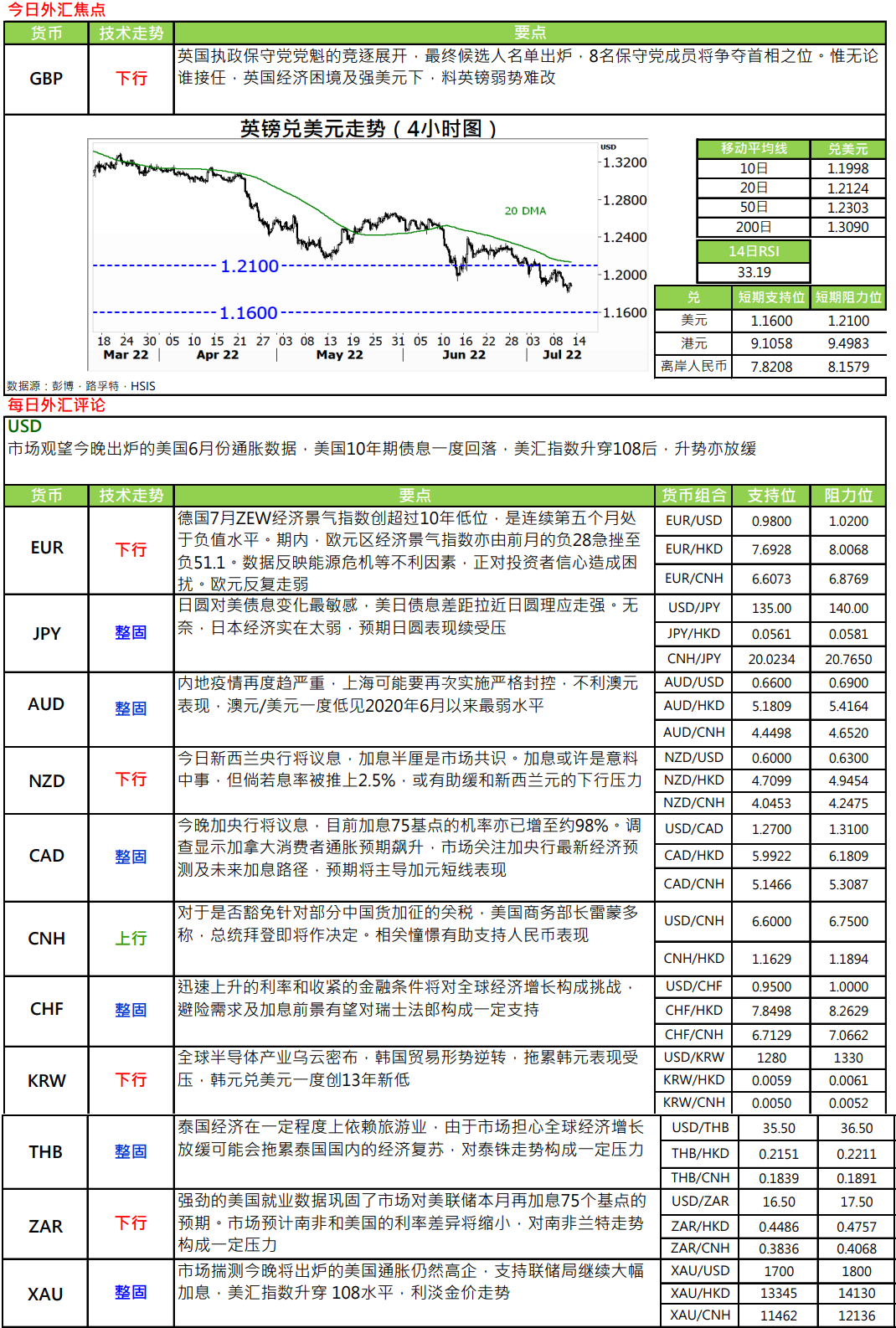 · 德国 7 月 ZEW 经济景气指数急挫至负 53.8,创超过 10 年低位,是连续第五个月处于负值水平,且远低于市场预期的负 38.3,前值为负 28.期内,当前现况指数由负 27.6 急挫至负 45.8,数据反映德国能源供应危机、欧央行加息,以及内地疫情再现等不利因素,正对投资者信心造成严重困扰。同期,欧元区 ZEW 经济景气指数亦由前月的负 28 急挫至负 51.1.