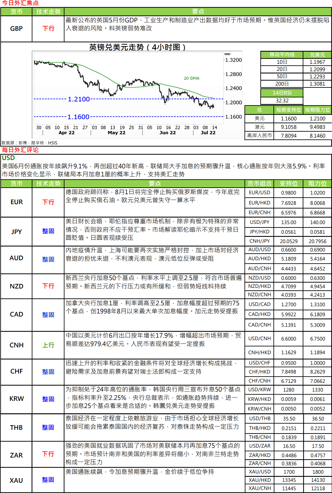 · 加央行周三晚议息会后宣布加息 1 厘,把其官方息率推上 2.5%水平。市场原先估计加央行只加 75基点。在其声明中加央行指,当地经济呈现明显的过度需求,物价不单高企且在扩散,企业及消费者普遍预期通胀仍将会上升,并有机会维持高企一段长时间。基于上述原因,该行必须果断加息,以阻止通胀进一步上升。加央行向来强调「适度息率水平」(nominal neutral rate),即息率处于一个既不刺激经济,也不会使经济收缩的水平。而按照加央行所指,这息率水平正是介乎于 2%-3%之间。现在加元息率正处于这中央位置。对于通胀预期,加央行估计未来数月当地通胀率将平均介乎于 8%水平。加央行下次议息会是 9 月 7 日,市场估计加息半厘是共识,而加息 75 基点机率则只有四成
